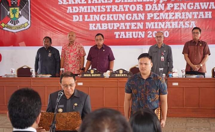 Tondano – Bupati Minahasa Dr. Ir. Royke Oktavian Roring MSi, IPU, Asean,Eng Mengambil Sumpah/Janji dan melantik Frits Muntu sebagai Sekretaris Daerah Kabupaten Minahasa, Jabatan Pimpinan Tinggi Pratama, Administrator dan Pengawas di lingkungan pemerintah Kabupaten Minahasa di Aula Benteng Moraya, Jumat 13 Maret 2020.