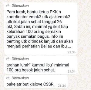“Para lurah, bantu ketua PKK n koordinator emak2 utk ajak emak2 utk ikut jalan sehat tanggal 26 okt, Sabtu ini, minimal yg ikut tiap kelurahan 100 orang semakin banyak semakin bagus, info ini penting utk ditindak lanjuti dan akan menjadi perhatian Beliau dan lbu,” demikian bunyi kutipan pesan whatsapp yang beredar itu.